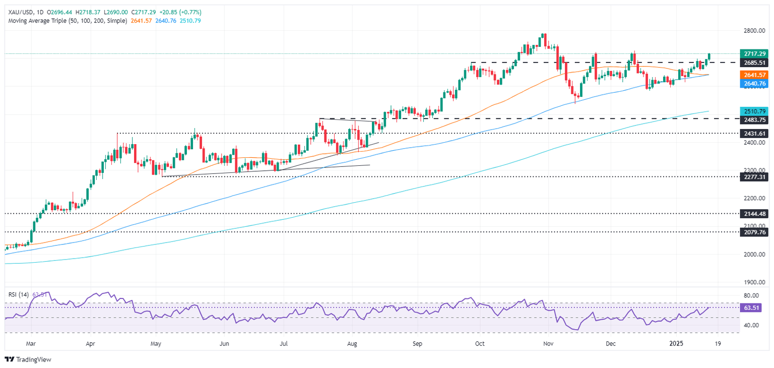 Gold’s uptrend is set to continue, but buyers will face key resistance at $2,726, the December 12 high. A breach of the latter will expose $2,750 and the record high of $2,790. Conversely, if XAU/USD slips below $2,700, a pullback is seen toward the January 13 swing low of $2,656.