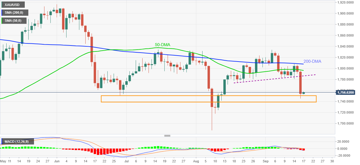 With the bearish MACD signals and sustained trading below the key moving averages joining Thursday’s support break, gold bears remain in control unless the quote bounces back beyond the support-turned-resistance near $1,786.