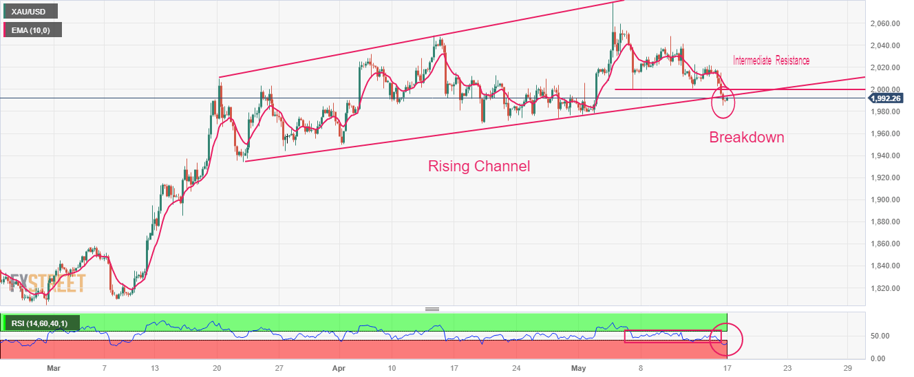 Gold price has delivered a breakdown of the Rising Channel chart pattern formed on a four-hour scale, however, the breakdown needs to pass some more filters yet. An intermediate resistance is plotted from May 05 low at $1,999.54. Downward-sloping 10-period Exponential Moving Average (EMA) at $2,000.00 is barricading the Gold bulls.
