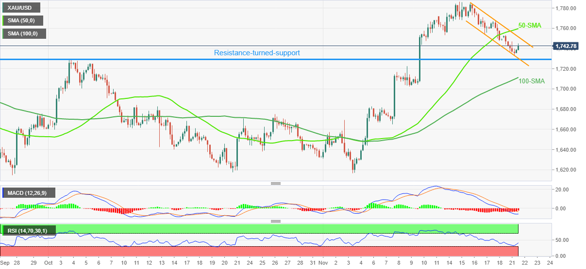 However, the RSI (14) rebound from the oversold territory underpins the recovery moves that challenge the bearish chart pattern, by approaching the stated channel’s resistance line surrounding $1,752.