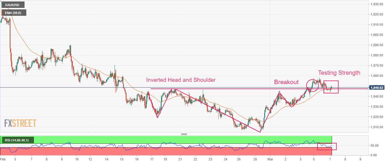 Gold price is testing the strength of the Inverted Head and Shoulder chart pattern breakout on an hourly scale. The precious metal is auctioning near the neckline plotted from February high at $1847.00. An Inverted H&S pattern demonstrates a prolonged consolidation and a breakout of the same result in a bullish reversal.