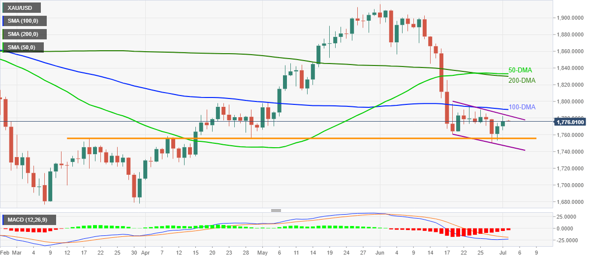 Gold (XAU/USD) struggles to extend the two-day bounce off the key support below $1,780, edges higher around $1,776 amid the initial Asian session on Friday. The yellow metal’s recovery moves fade amid the pre-US Nonfarm Payrolls (NFP) anxiety, even as the economic recovery hopes back the gold buyers.