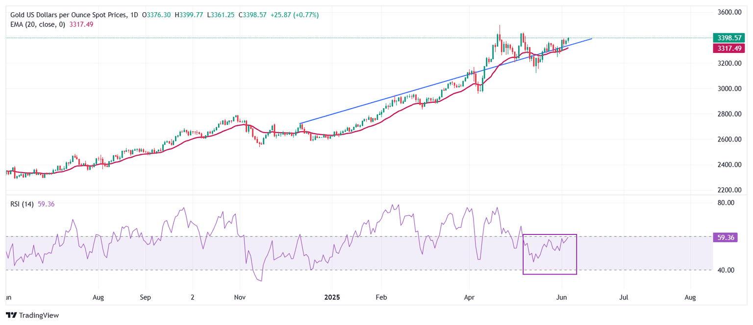 Gold price (XAU/USD) posts a fresh four-week high, advances to near $3,400 during European trading hours on Thursday. The yellow metal strengthens as uncertainty over potential trade deal between the United States (US) and China has accelerated, technically increasing the demand for safe-haven assets.