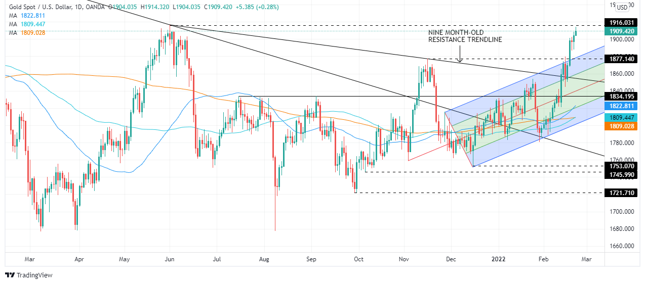 Gold is upward biased from a technical perspective. The daily moving averages (DMAs) reside well below XAU/USD spot price, with a bullish slope. That, alongside the break of a nine-month-old downslope resistance trendline, exacerbated the uptrend, helping XAU bulls reclaim the $1900 figure.