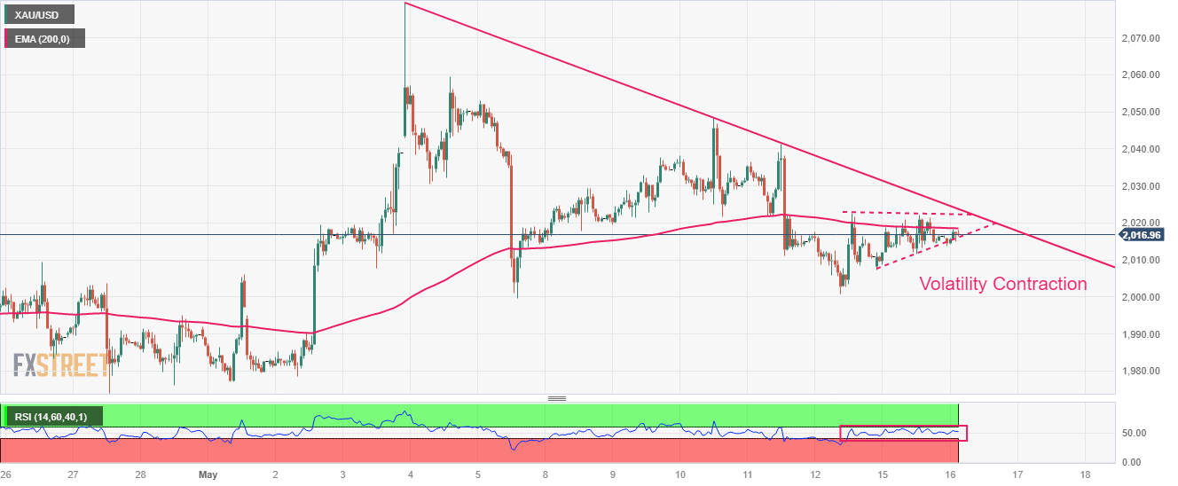 Gold price is forming a volatility contraction pattern around $2,020.00 on an hourly scale, which indicates a back-and-forth action. However, an explosion in the same results in wide ticks and heavy volume. The downward-sloping trendline plotted from all-time highs at May 03 high at $2,079.78 is acting as a barricade for the Gold bulls.