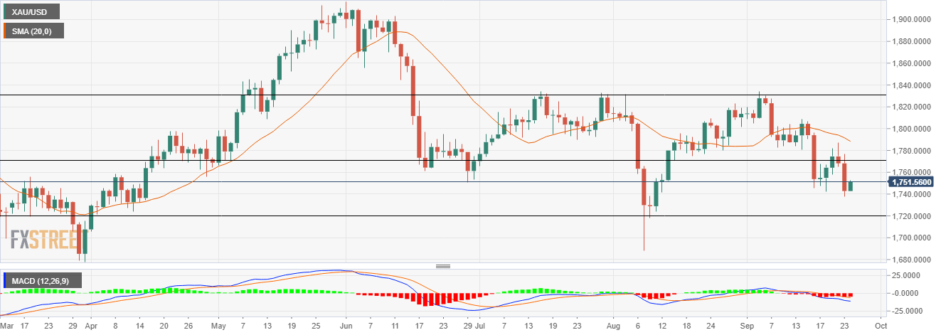 The Moving Average Convergence Divergence (MACD) holds below the midline with a bearish crossover. Any downtick in the MACD indicator would amplify the selling pressure and the prices would approach the low made on August 11 at $1,724.18. A daily close below the $1,720 horizontal support level would entice bears to retest the levels last seen in April. XAU/USD bears could meet the April 1 low at $1,705.84.