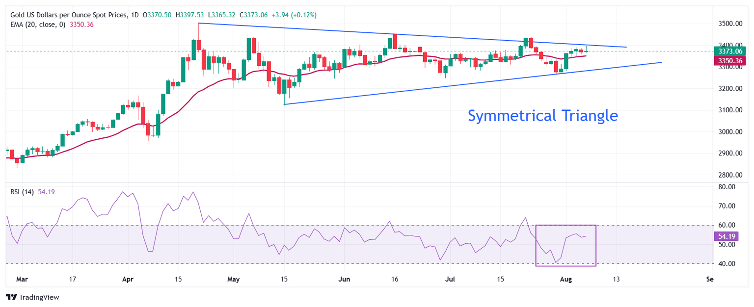 Gold price trades close to the upper boundary of the Symmetrical Triangle formation around $3,400, which is plotted from April’s high near $3,500. The lower boundary of the yellow metal is placed from the May’s low of $3,120.85.