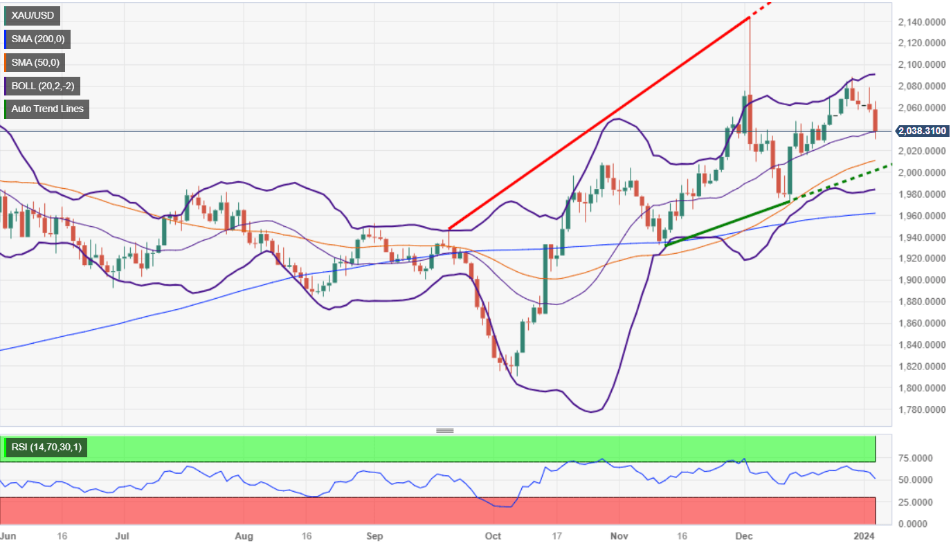 Gold price slid during the last hour on Wednesday after the US Federal Reserve (Fed) released December’s meeting minutes, which didn’t deliver any dovish hints. Therefore, the Greenback resumed to the upside and reached a new 11-day high before retracing somewhat. At the time of writing, XAU/USD is trading at $2040 per troy ounce, down by more than 0.90%.