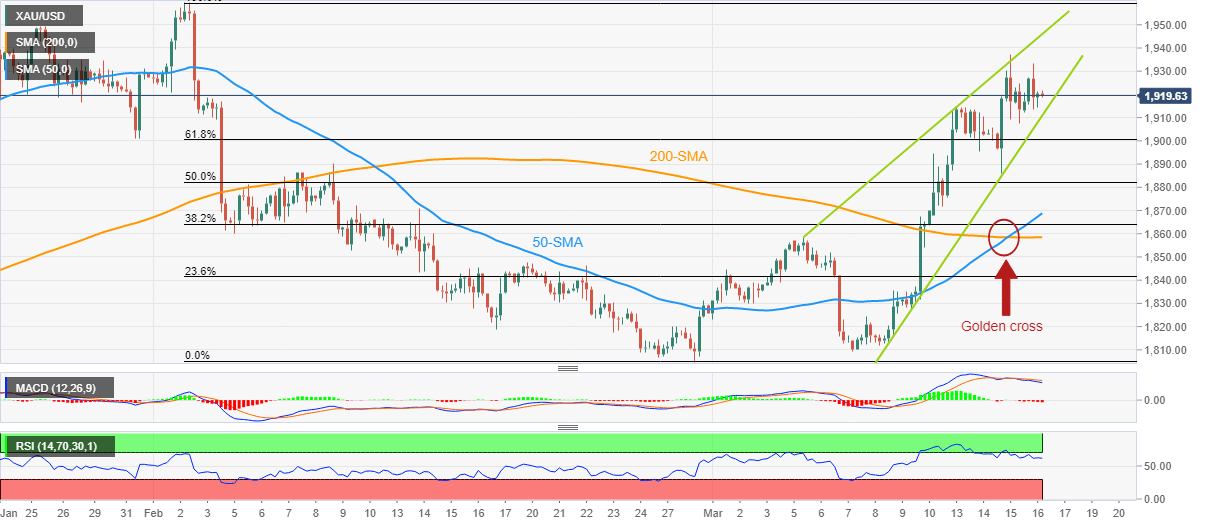 Gold price recently eased from the multi-day high as the United States Treasury bond yields bounced off the latest troughs as the market sentiment improves and traders gear up for the next week’s Federal Reserve (Fed) meeting. Even so, the second consecutive weekly loss for the benchmark bond coupons allows the XAU/USD to brace for a three-week uptrend, as well as the biggest weekly gain since early January.