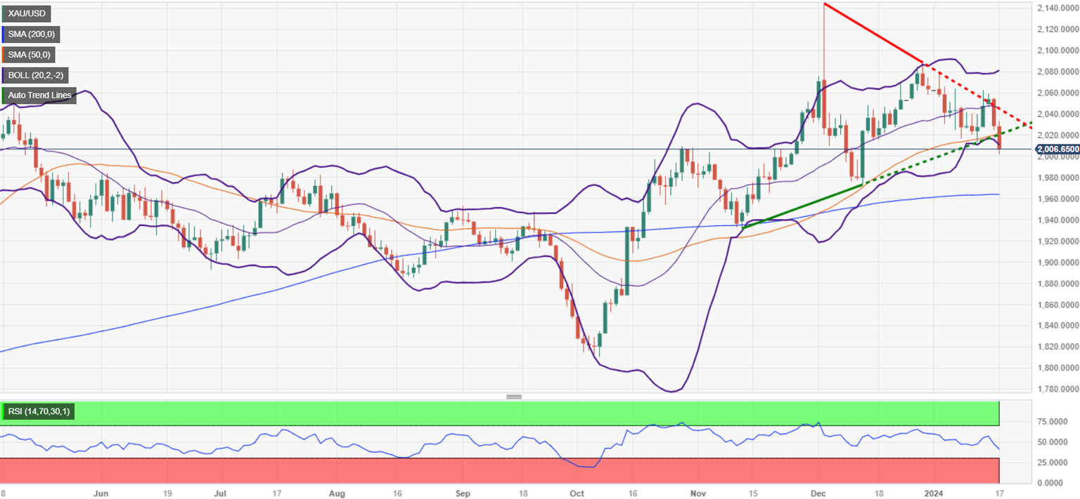 The XAU/USD diving below the 50-day moving average (DMA) exacerbated the drop toward the $2001 year-to-date (YTD) low. Although buyers of the non-yielding metal moved in and lifted the spot price to current levels, Gold is at the brisk of extending its losses, below the $2000 mark. A decisive break of that level will expose the confluence of the 100 and 200-DMAs at around $1971/$1963, respectively.