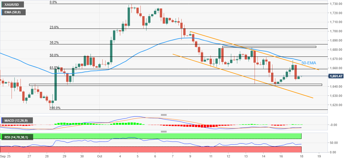 Gold price remains inside a five-week-old bearish channel amid sluggish MACD and RSI (14), which suggests the metal stays on the seller’s radar unless crossing the formation’s upper line, around $1,664 by the press time.