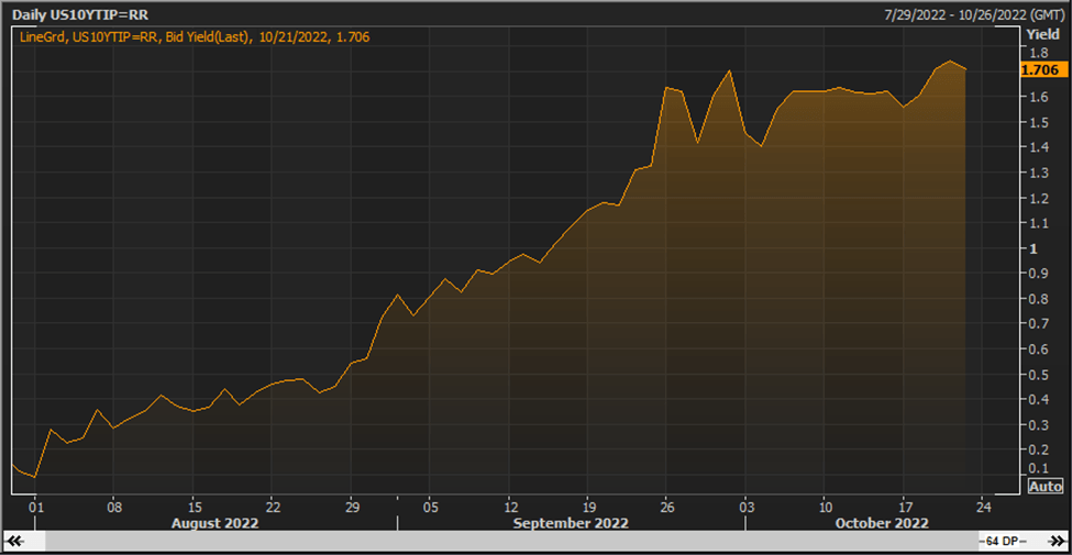 The US 10-year T-bond yield is gaining two bps, up at 4.250%, well below the YTD high of 4.338%, a level last seen before the global financial crisis in 2007. Also, US real yields retreated from 1.838% to 1.706% as measured by the US 10-year Treasury Inflation-Protected Securities (TIPS) bond yield, giving a respite to the yellow metal holders.