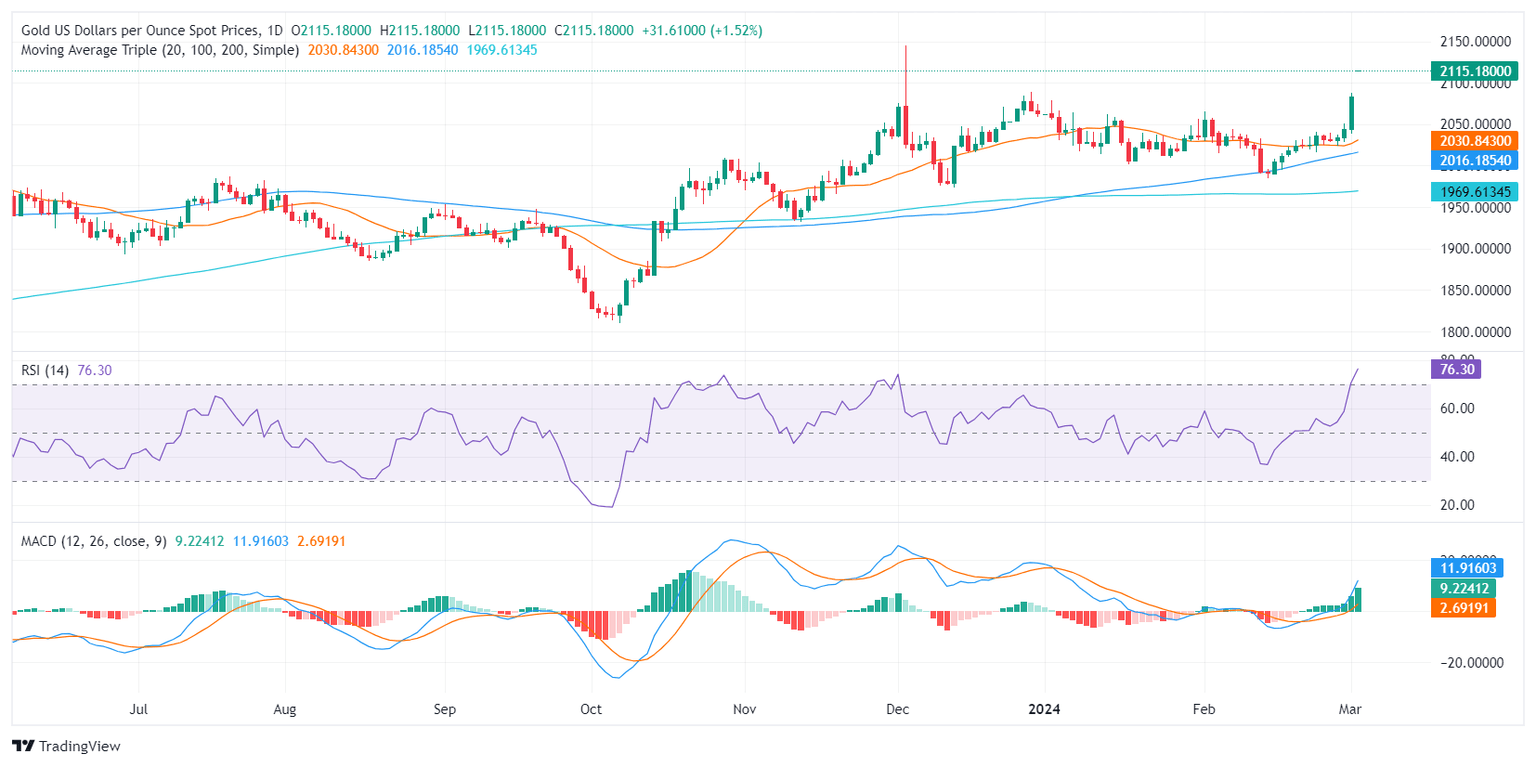 - The XAU/USD is currently trading at $2,115, its highest since early December.