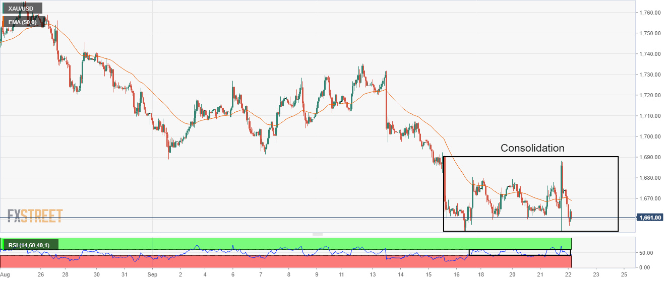 Gold price (XAU/USD) is resuming its downside journey after a less-confident pullback to nearly $1,664.00 in the Asian session. The precious metal is expected to surrender the critical support of $1,654.00 and the investing community will witness a fresh two-year low. The gold prices have weakened dramatically as the Federal Reserve (Fed) chair Jerome Powell has delivered higher-than-expected hawkish guidance on interest rates to wipe off the add-on inflation beyond the desired rate of 2%.