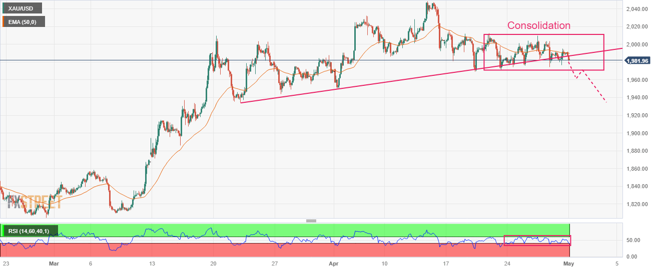 Gold price (XAU/USD) is declining towards its crucial support of $1,970.00 in the Asian session. A solid recovery in the US Dollar Index (DXY) amid upbeat expectations that the Federal Reserve (Fed) will raise interest rates one more time by 25 basis points (bps) on Wednesday is impacting the Gold price. The precious metal might show a significant fall after a confident break below $1,970.00 as it has been acting as a major support from the past week.