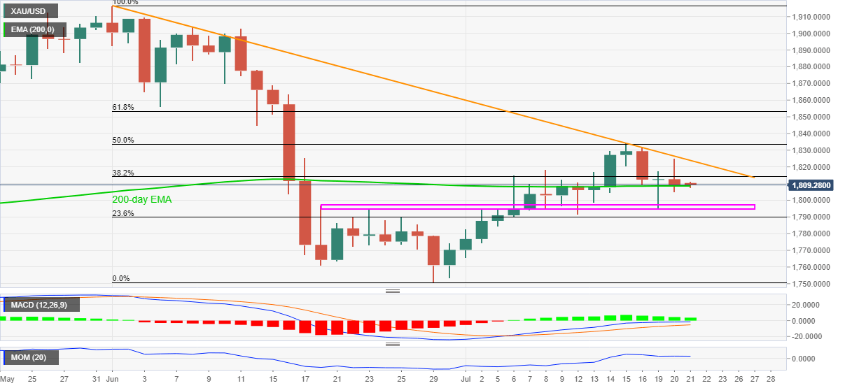 Gold (XAU/USD) struggles to defend the $1,800 threshold, grinds lower around $1,809, as of Wednesday’s Asian session trading gains momentum.