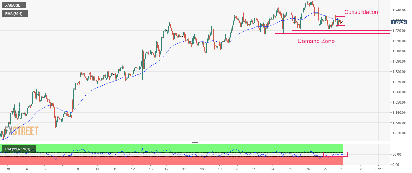 Gold price is juggling in a small range bounded consolidation on an hourly scale that indicates volatility contraction. The 50-period Exponential Moving Average (EMA) at $1,930.00 had been a significant barricade for the Gold bulls. The demand zone in a $1,917-1,920 range will support the asset ahead.