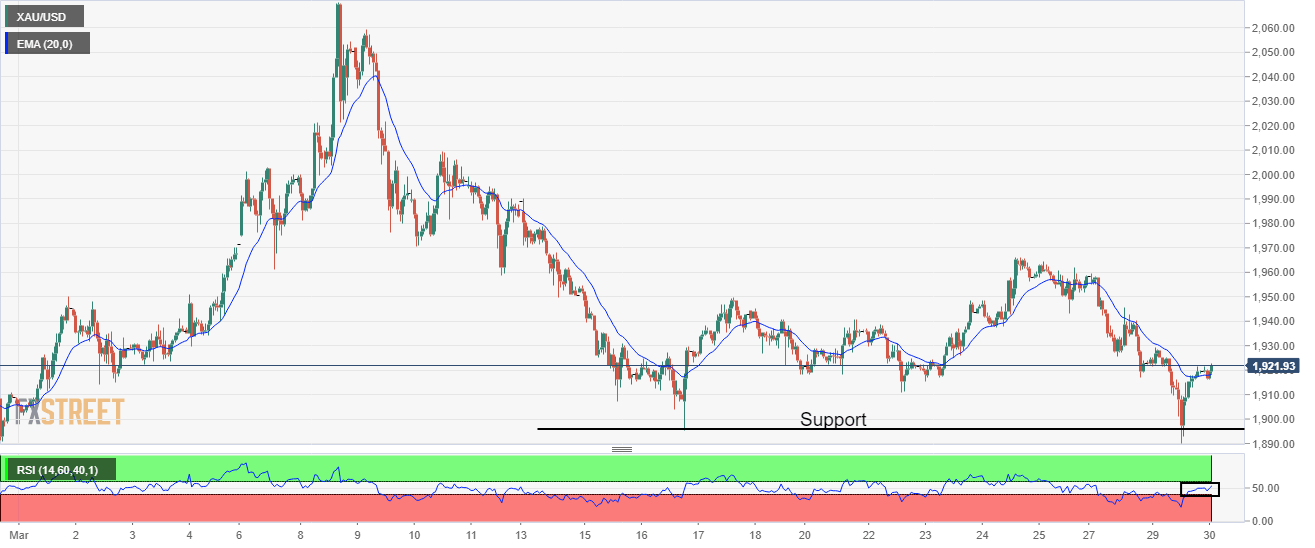 On the hourly scale, XAU/USD has sensed responsive buying after the re-test near March 16 low at $1,895.15. The precious metal has overstepped the 20-period Exponential Moving Average (EMA). The Relative Strength Index (RSI) (14) has shifted into a 40.00-60.00 range, which signals a consolidation ahead.