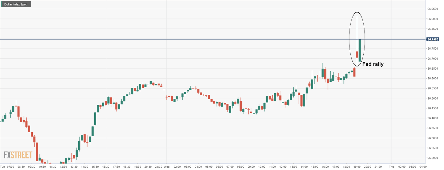 - US dollar has rallied 30 points in the DXY on an uber hawkish Fed but is stalling.
