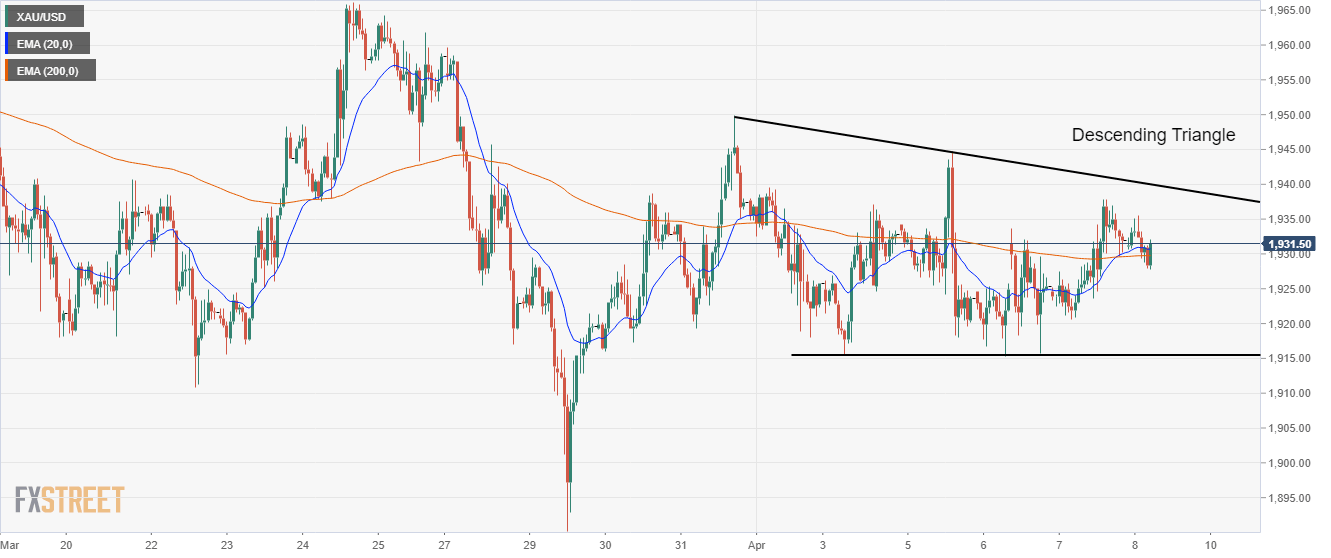 On an hourly scale, XAU/USD is oscillating in a descending triangle formation whose horizontal support is placed at $1,915.50 while the descending trendline is plotted from March 31 high at $1,949.89. The 20- and 200-period Exponential Moving Averages (EMAs) are overlapping each other, which signals a consolidation ahead.