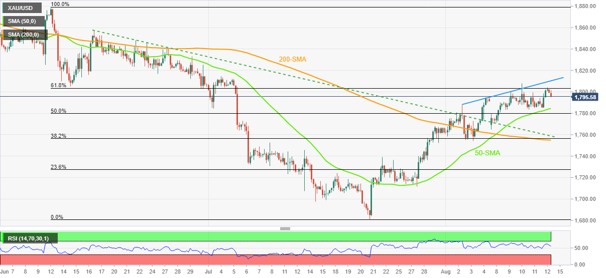Alternatively, an upside clearance of the 61.8% golden ratio, close to $1,805, might not be above to propel the XAU/USD prices as a fortnight-old resistance line near $1,811 acts as an extra filter to the north.