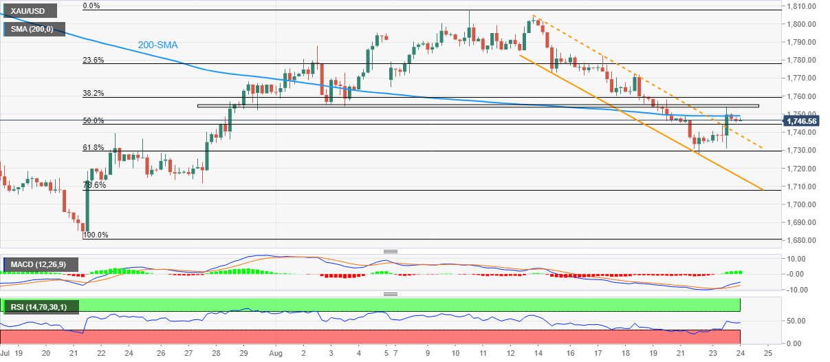 Gold price (XAU/USD) returns to the bear’s radar after the previous day’s failure to recall buyers near the monthly low. That said, the precious metal retreats to $1,746 during the mid-Asian session on Wednesday.