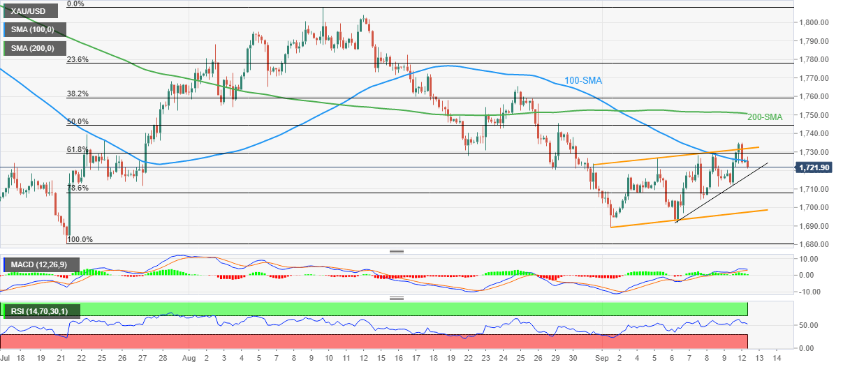 However, a one-week-old support line, near $1,717, restricts the immediate downside of the XAU/USD, a break of which could direct bears towards the stated channel’s support line, close to $1,697 at the latest.