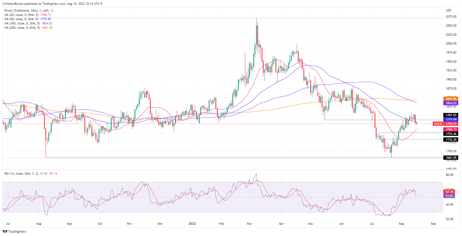 From a daily chart perspective, XAU/USD is neutral biased, clinging underneath the 50-day EMA at $1780. It’s worth noting that the RSI points downwards, closing to the 50-midline, and the 100-day EMA crossed below the 200-day EMA, which could exacerbate a move lower. Nevertheless, unless sellers reclaim the 20-day EMA at $1760.70, consolidation in the $1780-$1810 area is on the cards.