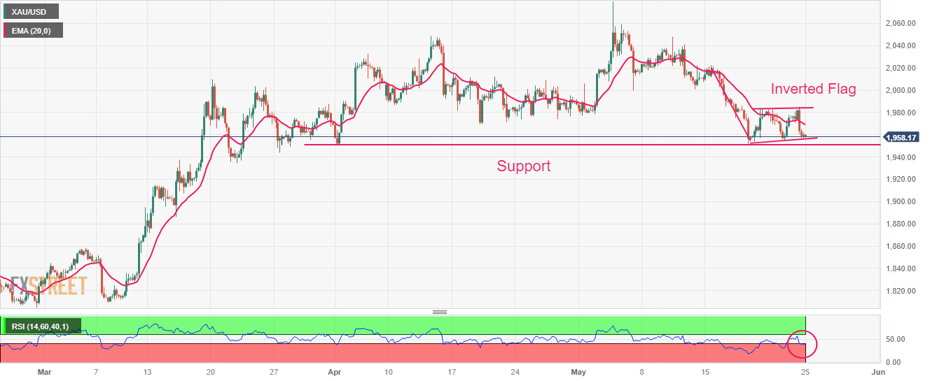 Gold price is forming an Inverted Flag chart pattern on a four-hour scale, which is a trend continuation pattern in which a long consolidation is followed by a breakdown. The Gold price is hovering above the horizontal support plotted from April 03 low at $1,949.83.