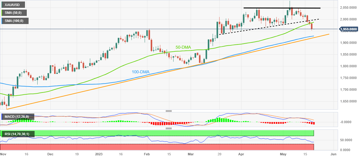 Gold price (XAU/USD) licks its wounds at the multi-day low amid Friday’s sluggish Asian morning as the market’s previous optimism fades amid recent challenges for the key risk catalysts. Even so, the optimism surrounding the United States debt ceiling passage and the hawkish Federal Reserve (Fed) bets are strong enough to prod the XAU/USD bulls ahead of Fed Chair Jerome Powell’s speech. That said, the Gold price steadied near $1,960 by the press time, after falling to the lowest levels since April 03 the previous day during its three-day downtrend.