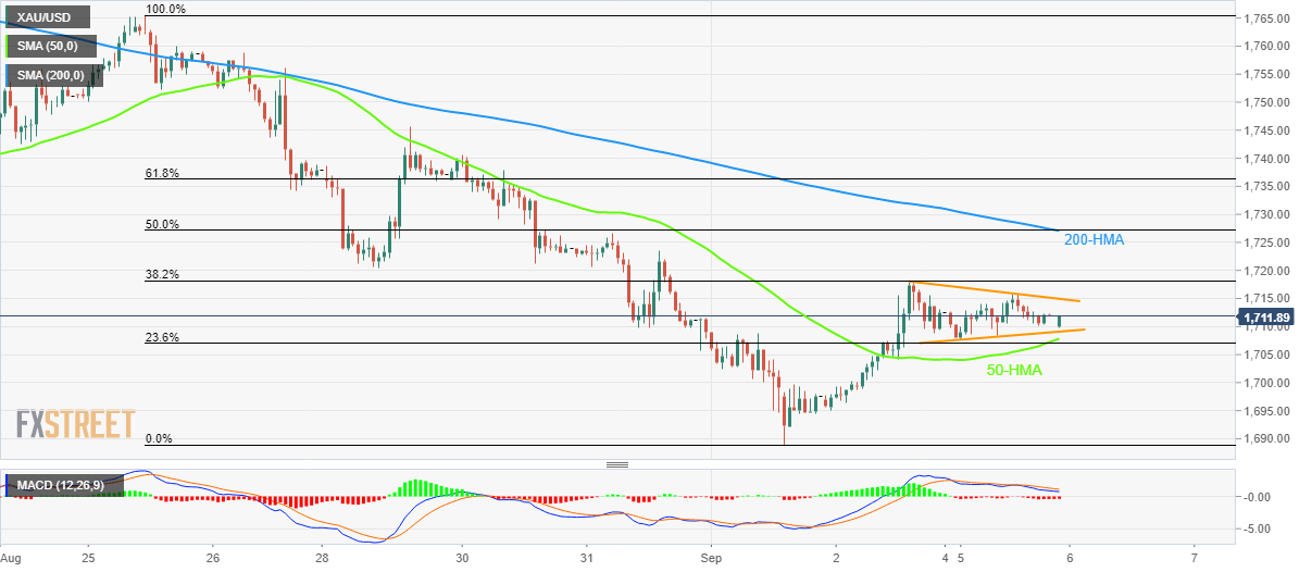 In addition to the triangle area between $1,709 and $1,715, the 50-HMA and the 200-HMA also restrict short-term XAU/USD moves around $1,707 and $1,727 in that order.