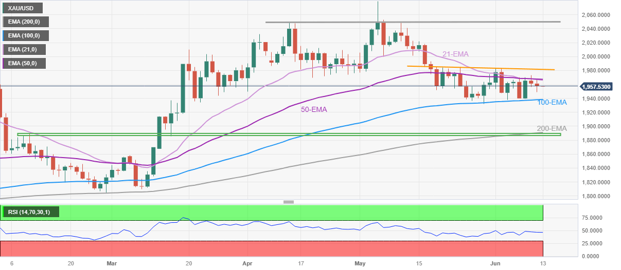 Gold Price (XAU/USD) prods a two-day downtrend with the latest corrective bounce off $1,950, grinding higher as it approaches the key $1,967 resistance confluence during early Tuesday in Asia, close to $1,958 at the latest. That said, the XAU/USD began the week on a back foot amid the market’s indecision ahead of the top-tier central bank events and doubts about the major consensus favoring no rate hike from the Federal Reserve (Fed). However, the US Dollar’s failure to stay strong joins the mixed headlines about the central banks and Treasuries, as well as geopolitics, to allow the precious metal to consolidate recent losses ahead of the key United States Consumer Price Index (CPI) data for May.