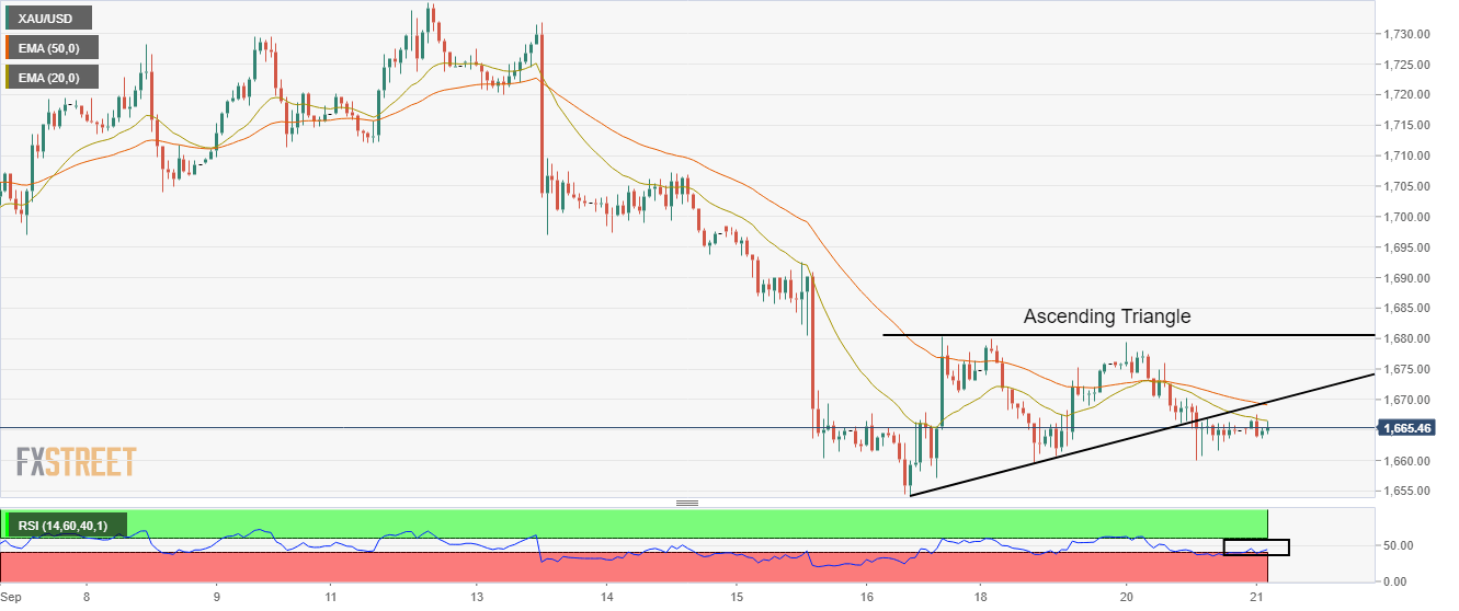 Gold prices have turned sideways after delivering a downside break of the Ascending Triangle whose upward-sloping trendline is placed from the previous week’s low at $1,654.17 while the horizontal resistance is plotted from Friday’s high at $1,680.39.