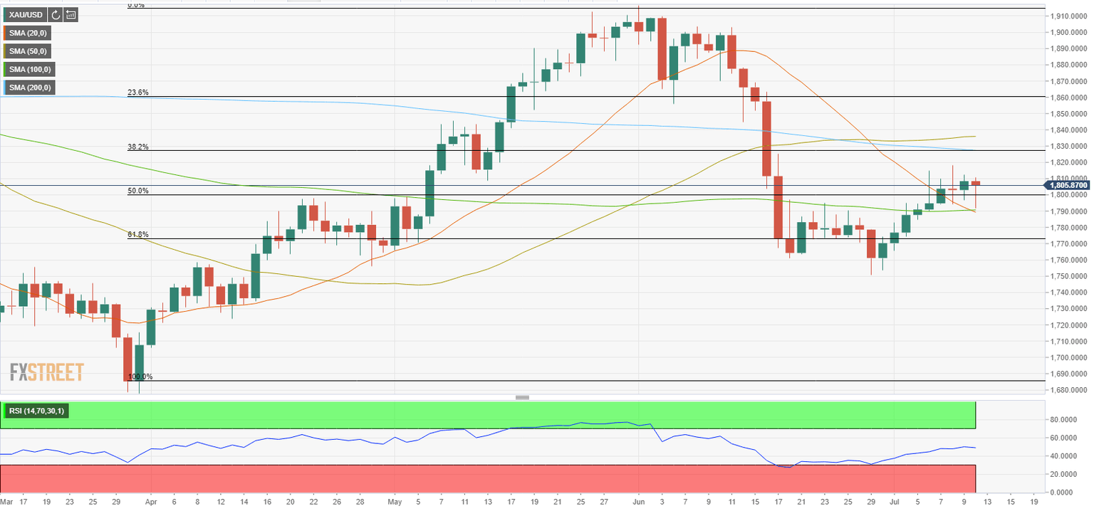 Update: Gold (XAU/USD) prices extend late Monday’s recovery moves beyond $1,800, around $1,806, amid the initial Asian session on Tuesday. The yellow metal seems to track gains in the equity markets, ignoring the rebound in the US dollar index (DXY) and Treasury yields.