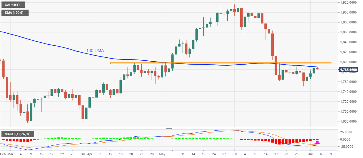 Gold (XAU/USD) prices remain sidelined, recently picking up bids, around $1,787 as European traders brace for Monday’s bell. The yellow metal rose for three consecutive days the last before recently battling the key moving average, namely 100-DMA, amid subdued markets.