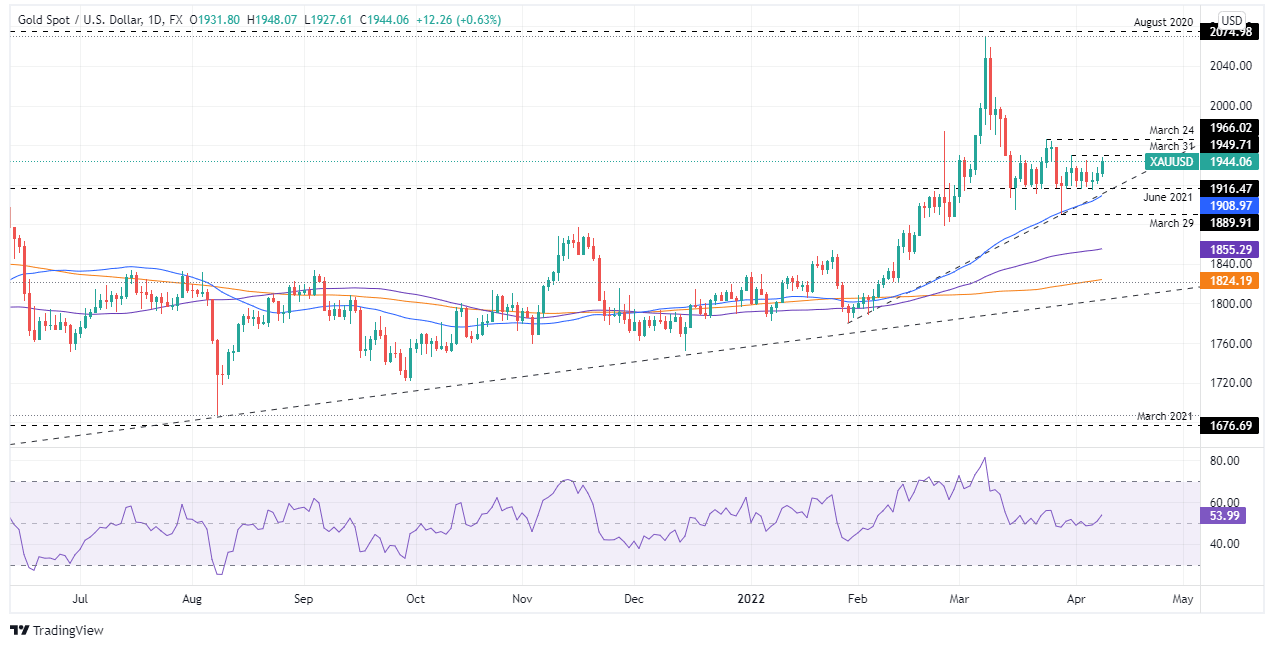 Gold (XAU/USD) remains buoyant despite rising US Treasury yields amidst an upbeat market mood, as investors shrugged off the Ukraine-Russia brawl and a hawkish Federal Reserve, which according to March’s minutes, would hike 50-bps in the May meeting as well as reducing the $9 trillion balance sheet. At the time of writing, XAU/USD is trading at $1944 a troy ounce.