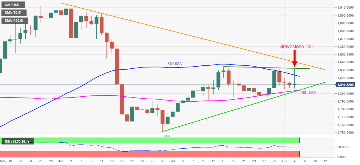However, a convergence of 100-DMA and an ascending trend line from June 29, near $1,804, followed by the $1,800 threshold, offers a tough nut to crack to the gold sellers.