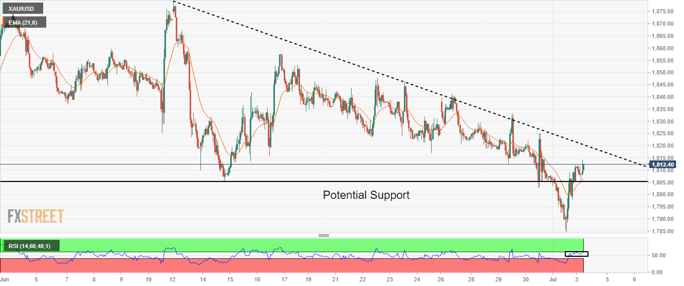 Gold price (XAU/USD) has overstepped the crucial resistance of $1,810.00 and is aiming to sustain above the same amid a weaker US dollar index (DXY). As investors have shifted to the sidelines ahead of the release of the June meeting minutes, the gold prices and the DXY are expected to display wild moves till then.