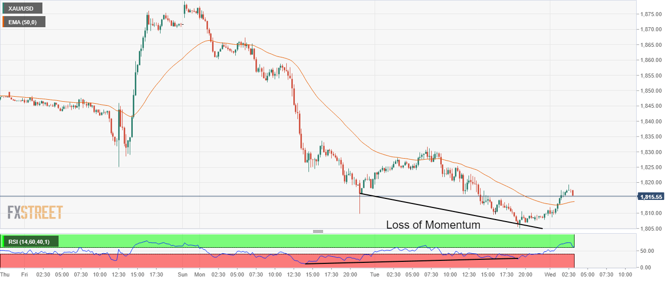 On an intraday sale, the downside move in the gold prices has displayed a loss of momentum, which has pushed the precious metal higher to near $1,820.00. The Relative Strength Index (RSI) (14) didn’t align with the gold prices and showed a higher low while the asset recorded a lower low. The precious metal has firmly crossed the 50-period Exponential Moving Average (EMA) at $1,813.82, which adds to the upside filters.