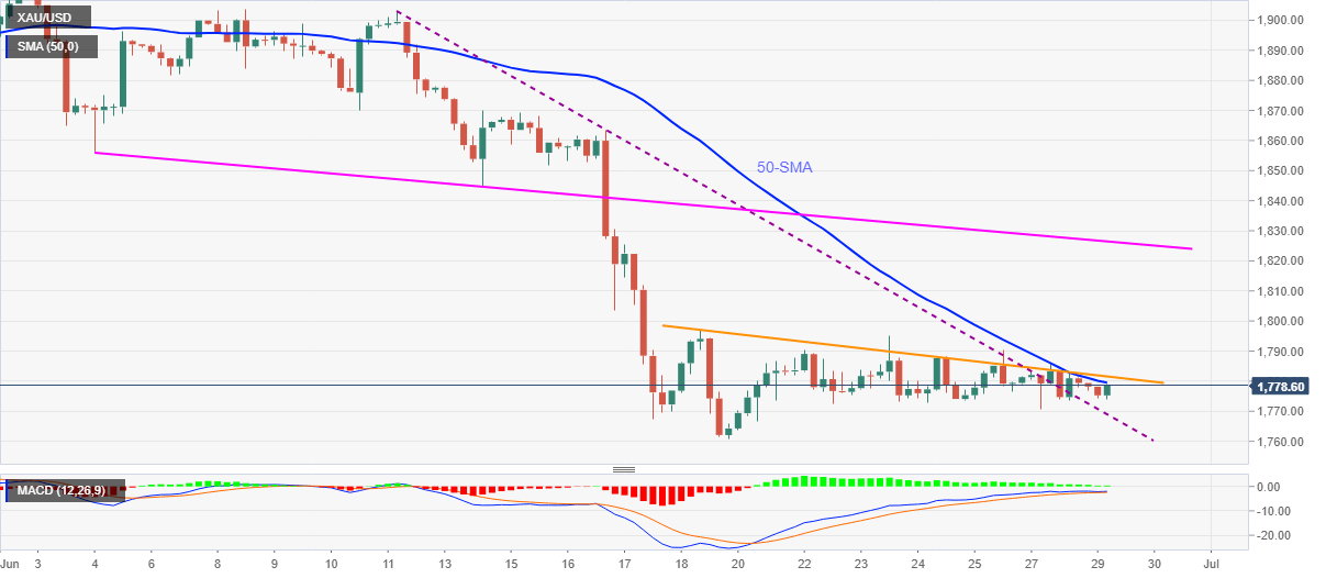 Previous update: Gold (XAU/USD) regains $1,778 during the bounce off an intraday low as European traders prepare for Tuesday’s bell. Even so, the US dollar strength and challenges to the risk appetite keep gold sellers hopeful amid downbeat technical formation.