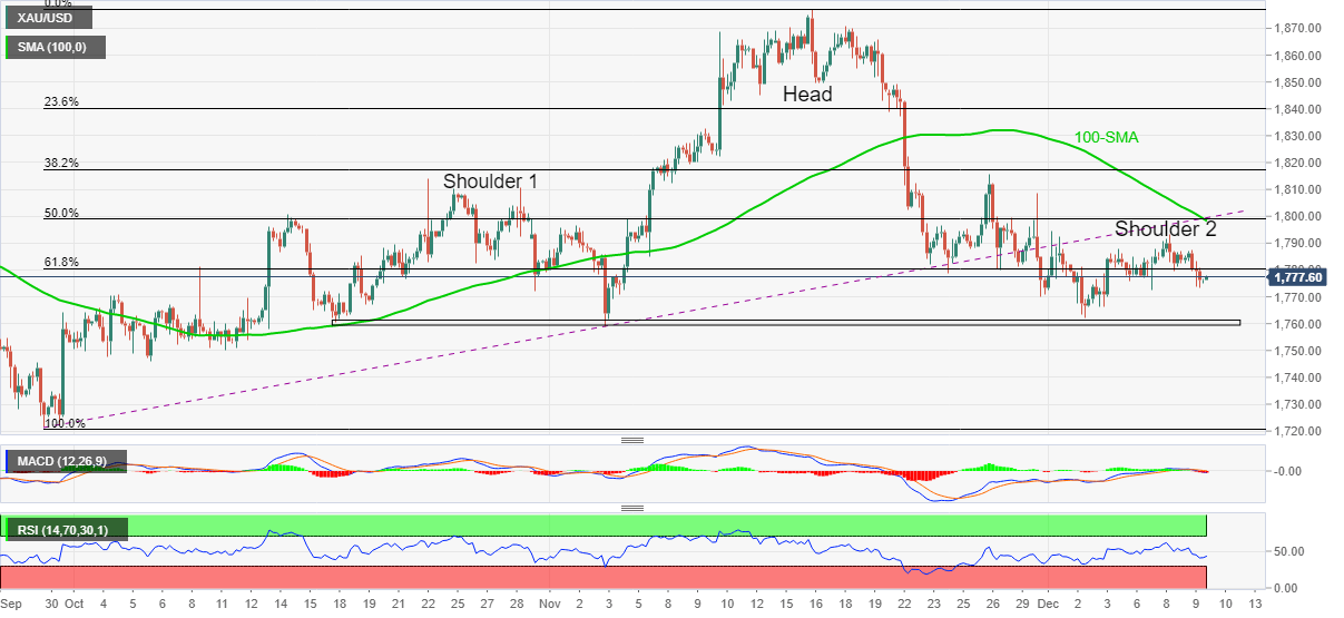 Gold is up for confirming head-and-shoulders bearish chart pattern on the four-hour play, highlighting the $1,760 neckline for the bears. Also favoring the sellers are the MACD signals and RSI retreat.