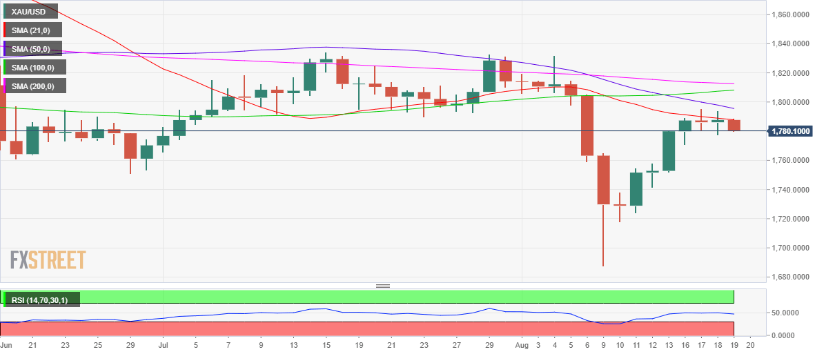 Gold price is pressurizing lows near $1780, looking for a sustained break below the round number to extend the downside towards the $1750 support area. The bearish sentiment grips gold price, as the US dollar holds the higher ground amid a double booster shot.