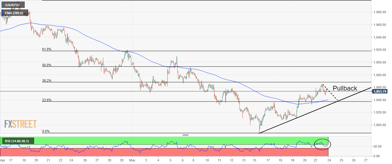 On an hourly scale, XAU/USD is holding above 23.6% Fibonacci retracement (placed from April 18 high at $1,998.43 to May’s low at $1,804.90) at $1,837.60. Gold bulls are firmer above the 200-period Exponential Moving Average (EMA) at $1,840.40. The trendline placed from May’s low at $1,804.90 will act as major support for the counter. A pullback move is expected towards the above-mentioned trendline after a bullish reversal to near $1,840.00. The Relative Strength Index (RSI) (14) has shifted lower from the bullish range of 60.00-80.00 but is expected to find support at 40.00.