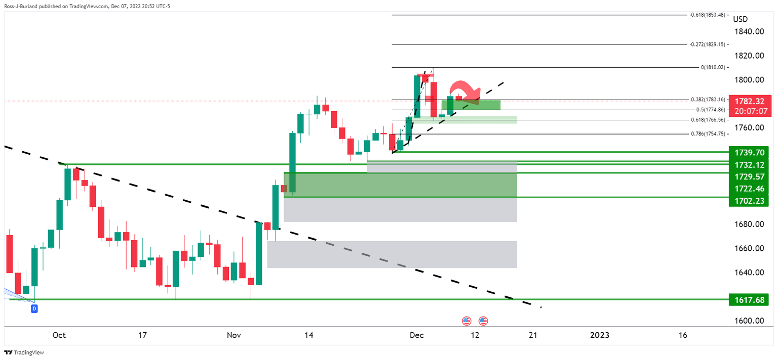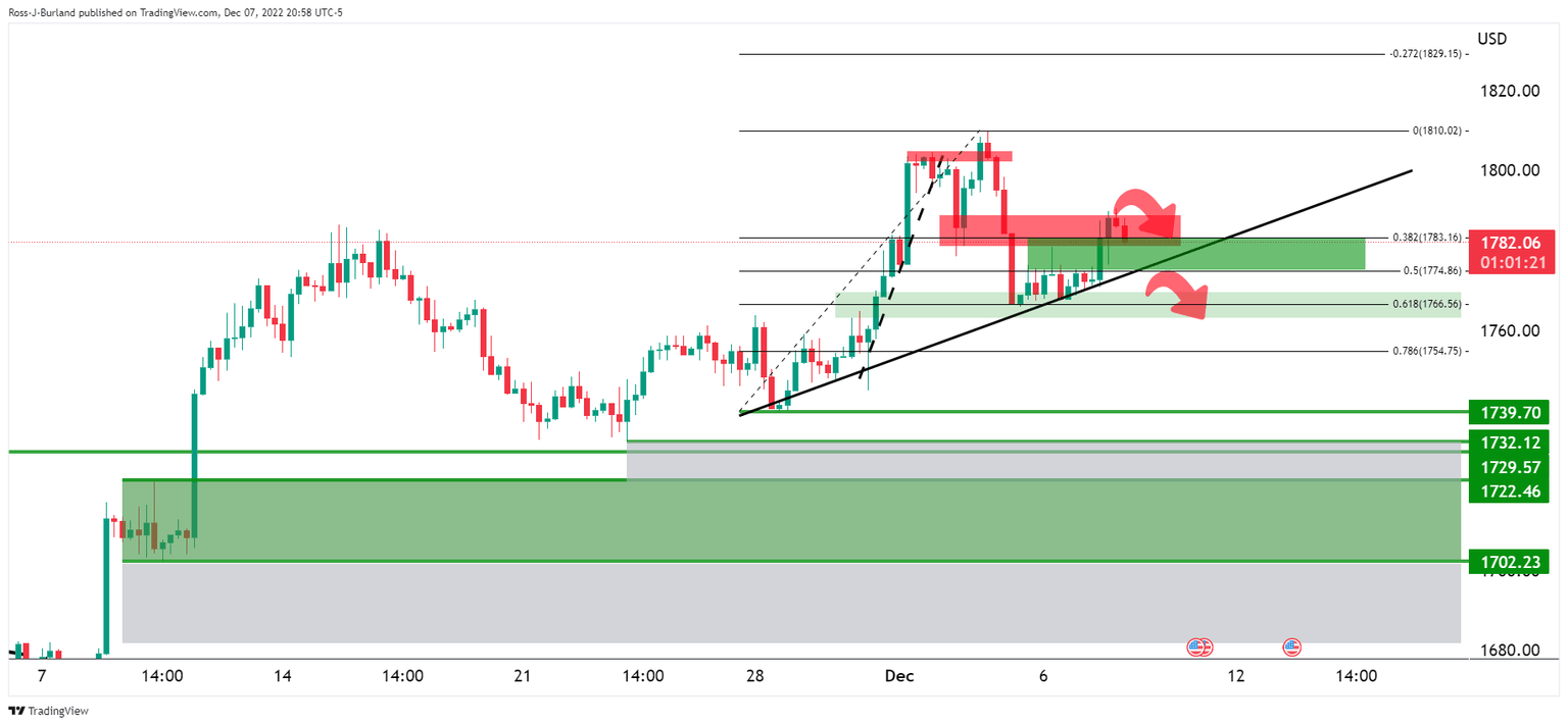 On the 4-hour chart below, the Gold price is hugging the dynamic support but is showing signs of an imminent test of the same. A break of the trendline will expose the downside in the Gold price with $1,739.79 eyed as the prior lows from where the last bullish surge originated.