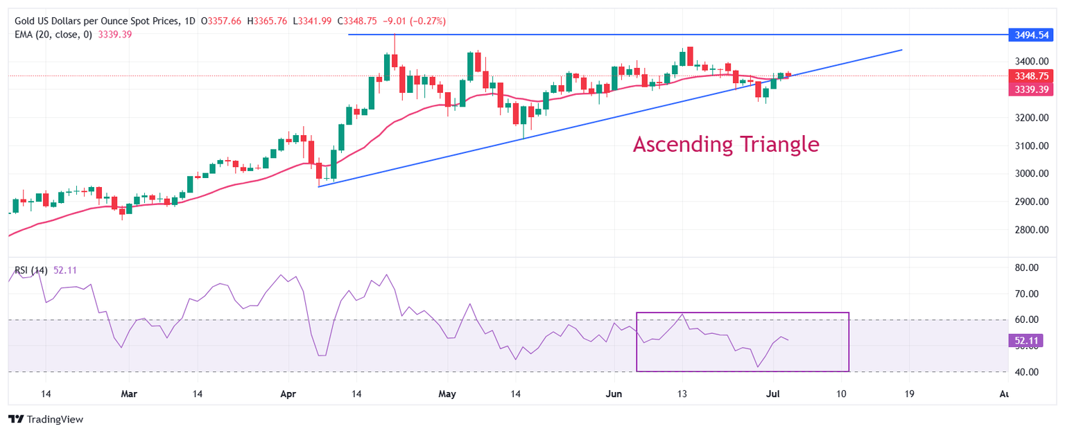 Gold price (XAU/USD) holds onto gains near the weekly high around $3,365 during the European trading session on Thursday. The yellow metal trades firmly ahead of the United States (USD) Nonfarm Payrolls (NFP) data for June, which will be published at 12:30 GMT.