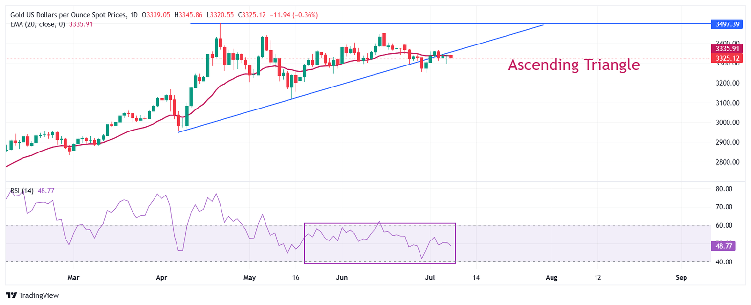 Gold price (XAU/USD) drops to near $3,325 during the European trading session on Tuesday. The yellow metal faces slight selling pressure as the market sentiment is favorable for risky assets, following the grace period from United States (US) President Donald Trump to allow trading partners to strike a trade deal.