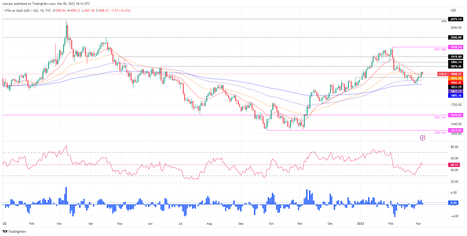 In addition to Jerome Powell’s appearance at the congress, XAU/USD traders are eyeing US employment data. The prior month’s US Nonfarm Payrolls report crushed estimates of 200K, creating more than 500K jobs in the economy. For February, market analysts expect an increase of just 200K compared to last month’s data. Upbeat data would send XAU/USD extending its losses, as further labor market tightening would warrant higher rates in the US economy, so it could be slowed down to curb inflation.