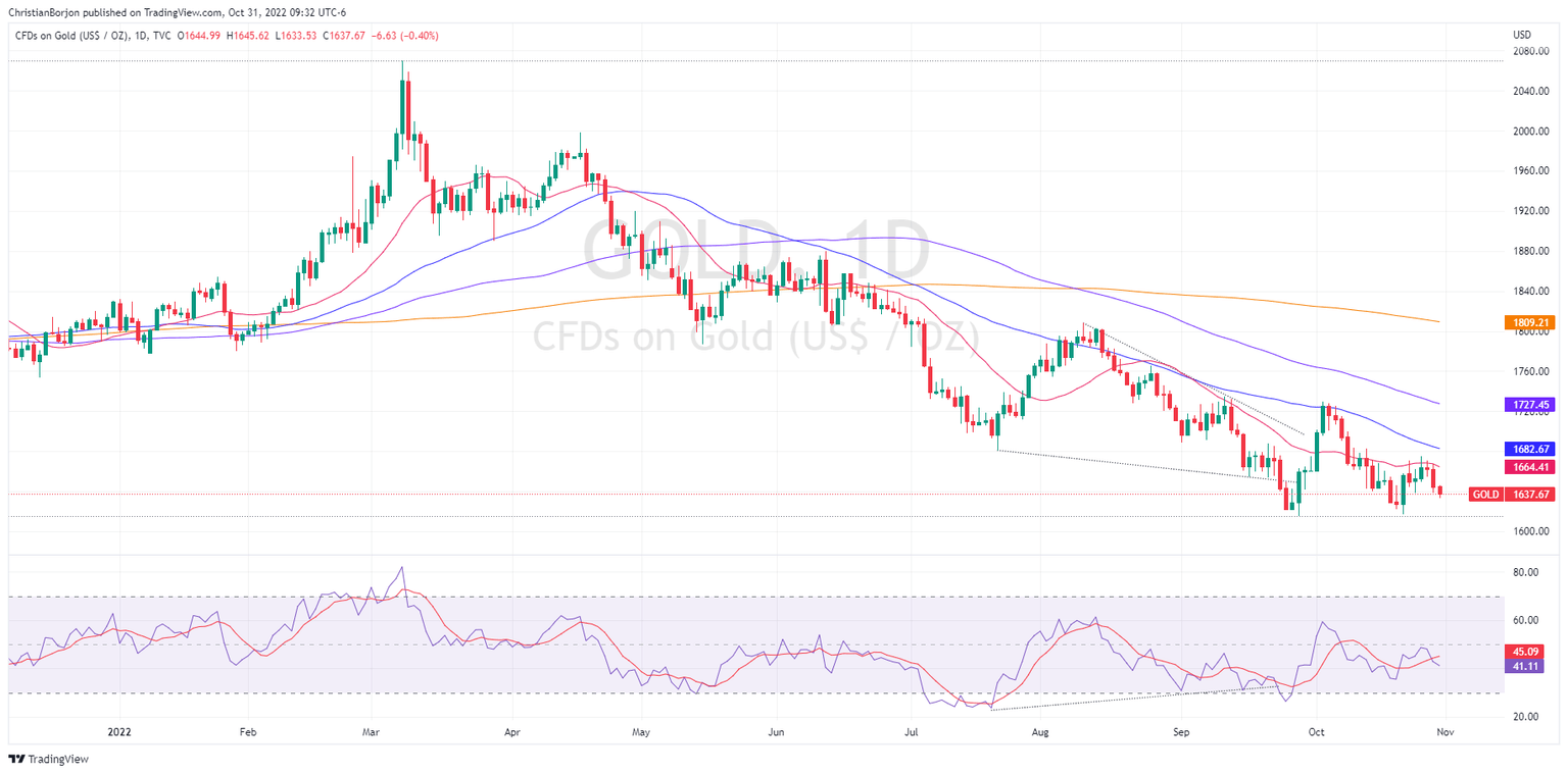 Gold price slides for the second consecutive day as the US dollar advances, ahead of the Federal Reserve Open Market Committee (FOMC) meeting, which is widely expected to deliver the last jumbo-size rate hike of the US central bank, amidst growing speculation for a Fed pivot, while recession fears increased. At the time of writing, the XAU/USD is trading at $1,637 a troy ounce, down by 0.39%.