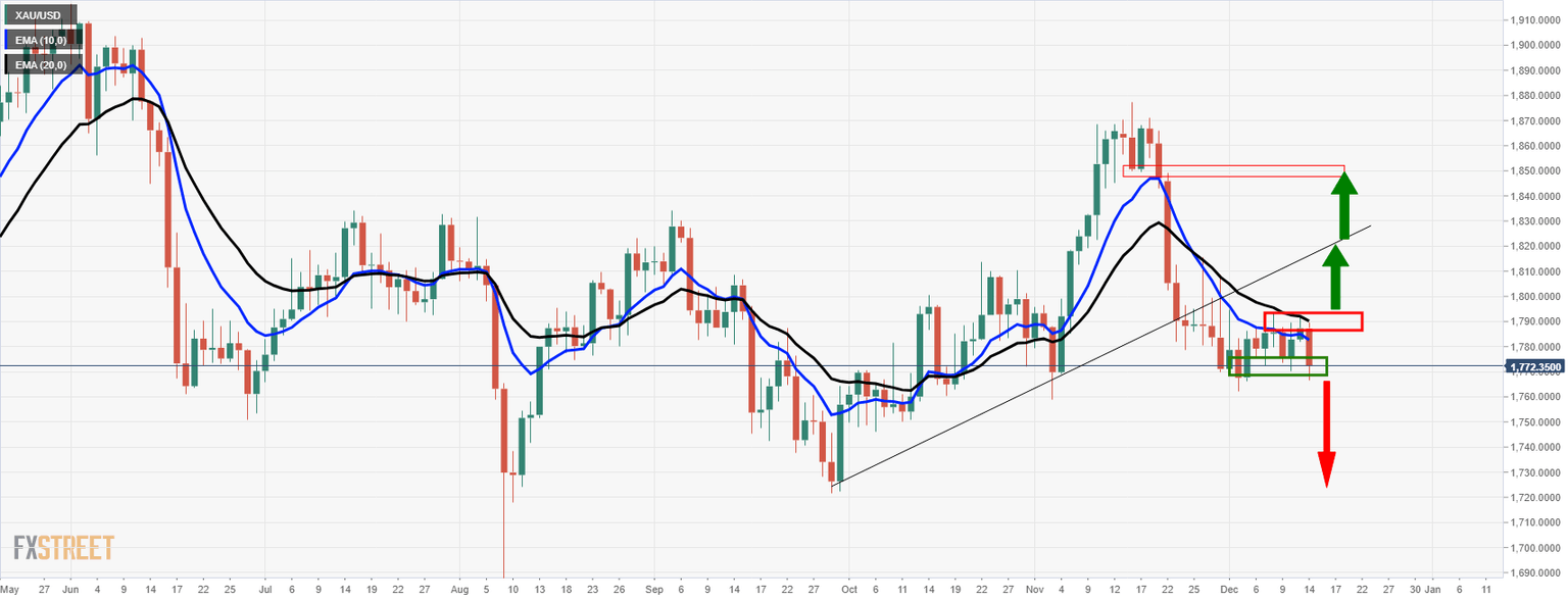 Gold prices are under pressure on Tuesday following US data and ahead of the Federal Reserve decision. The yellow metal broke below the $1780 support and tumbled to $1766, reaching the lowest level since December 3.