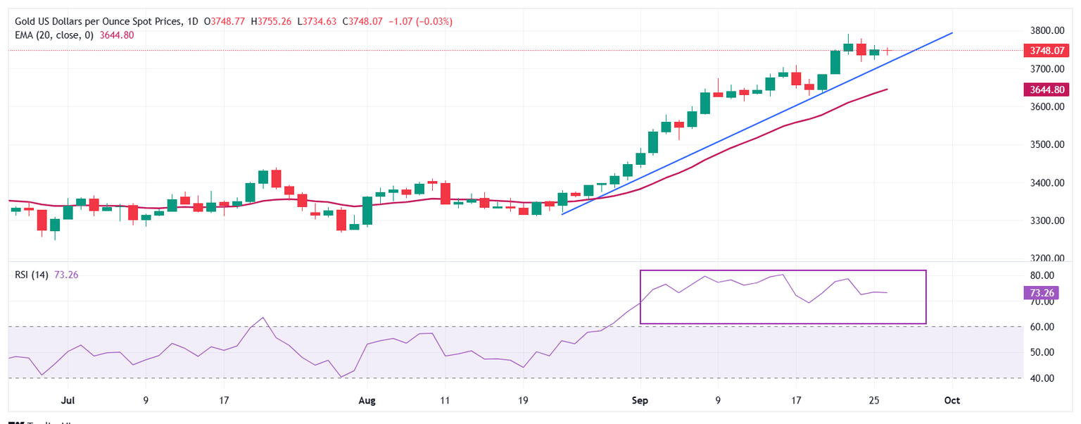 Gold price trades inside Thursday’s trading range around $3,750 on Friday. The near-term trend of the Gold price remains bullish as the 20-day Exponential Moving Average (EMA) slopes higher around $3,644.80. An upward-sloping trendline from the August 22 low around $3,321.50 will act as key support for the Gold price.